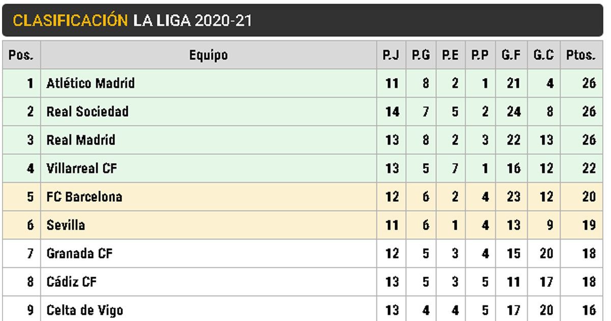 Tras el inicio de LaLiga, jugado por los cuatro equipos que se enfrentarán en la Supercopa de España A principios de enero, la clasificación de la competencia era un poco más ajustada. La victoria del Real Madrid le dejó como colíder de la competición, junto con Atlético de Madrid y Real Sociedad, Sin embargo él FC Barcelona Alcanzó posiciones europeas tras la victoria por 2-1 en el Camp Nou ante el equipo dirigido por Imanol Alguacil.